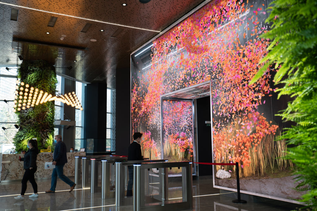 Konzeption und Produktion von 3D-Content für die permanente 54m² große LED-Wand-Installation im Foyer des SkyTower Bukarest.
