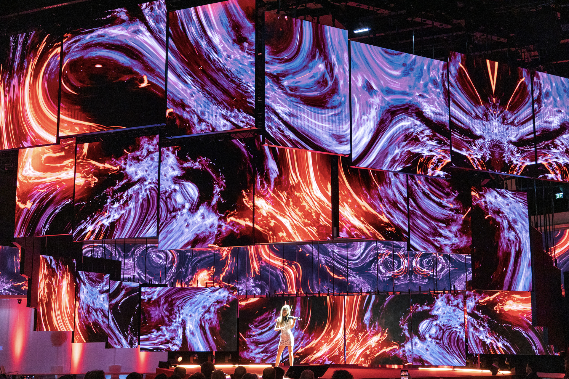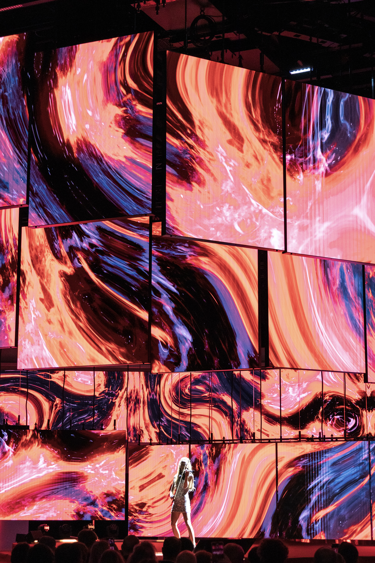 Das modulare Bühnensetup mit 52 beweglichen LED-Panels und über 108 Millionen Pixeln bot sieben verschiedene Konfigurationen, die den kompletten Raum transformierten und die Eingangshalle des ACV zu einer immersiven Erzählung werden ließ.
